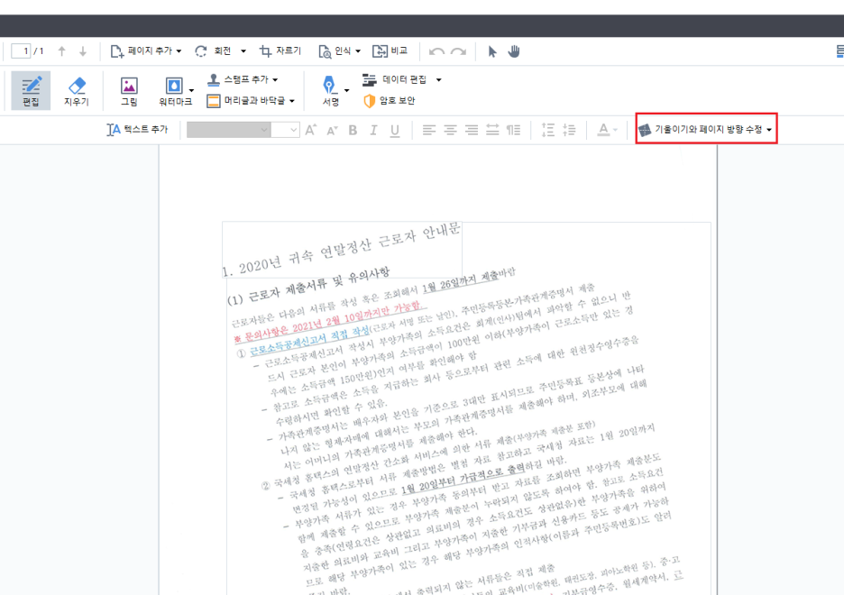[현재 페이지의 기울이기와 방향 수정] 클릭!
