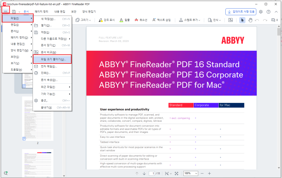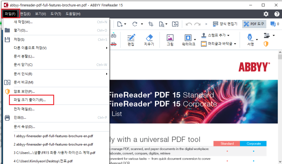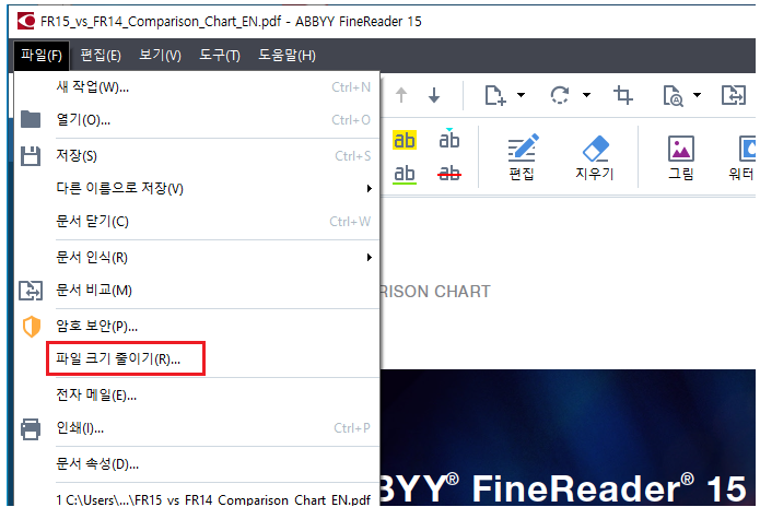 2. 상단 메뉴에서 파일 -> 파일 크기 줄이기를 클릭합니다.