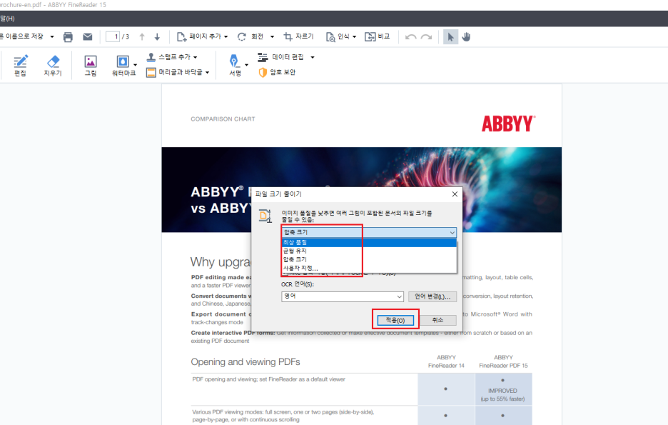 - 압축 크기: 낮은 화질의 이미지에 PDF 파일 크기를 줄입니다.
