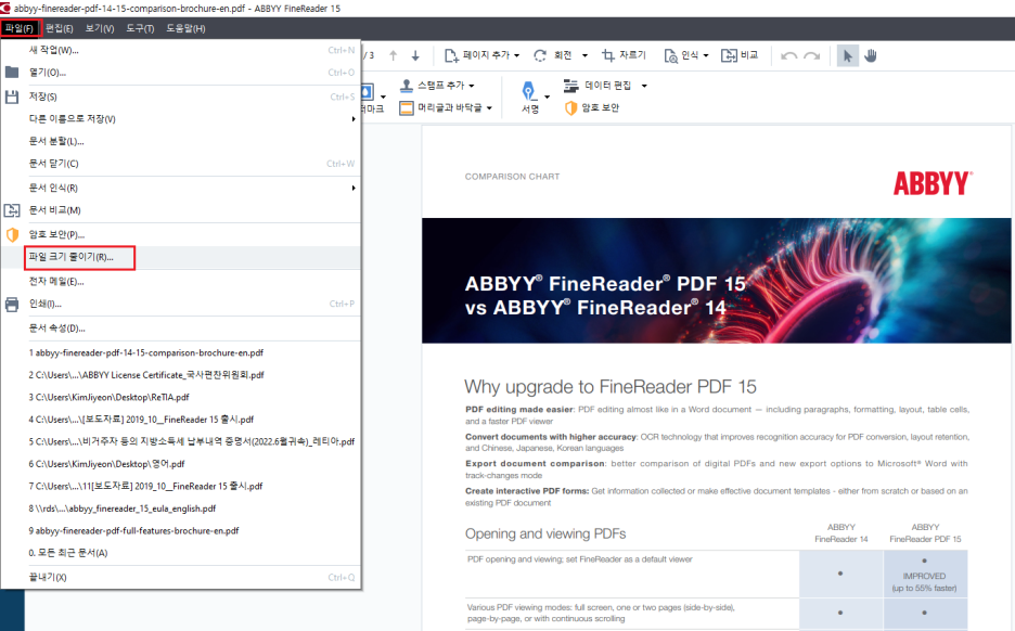 - 파일 불러오기: 파인리더를 실행하고 용량을 줄일 PDF 파일을 엽니다.