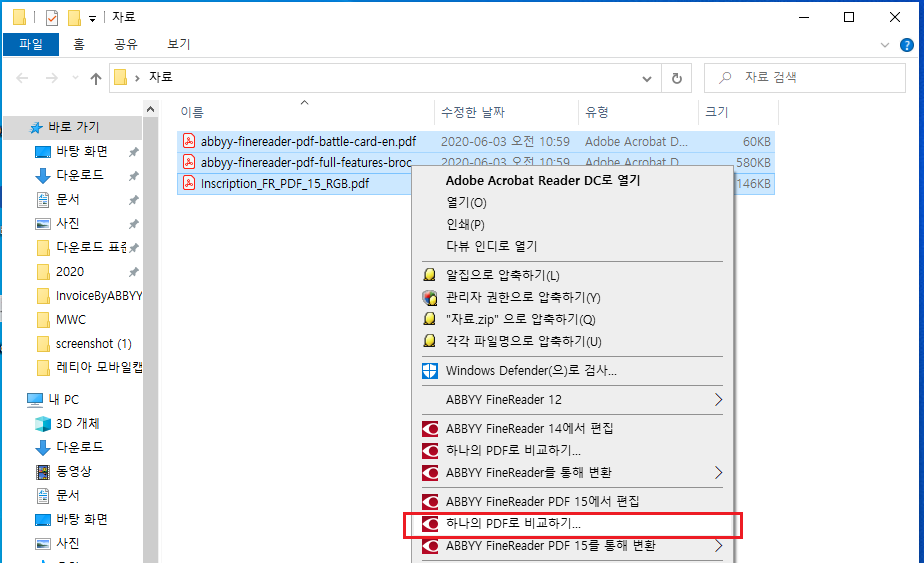 병합하려는 파일을 모두 선택 후 오른쪽 마우스 클릭 > "하나의 PDF로 비교하기" 를 선택해주세요.
