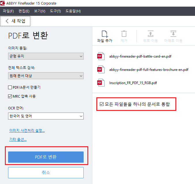 "모든 파일을 하나의 문서로 통합" 체크 후 > "PDF로 변환"을 눌러주세요.