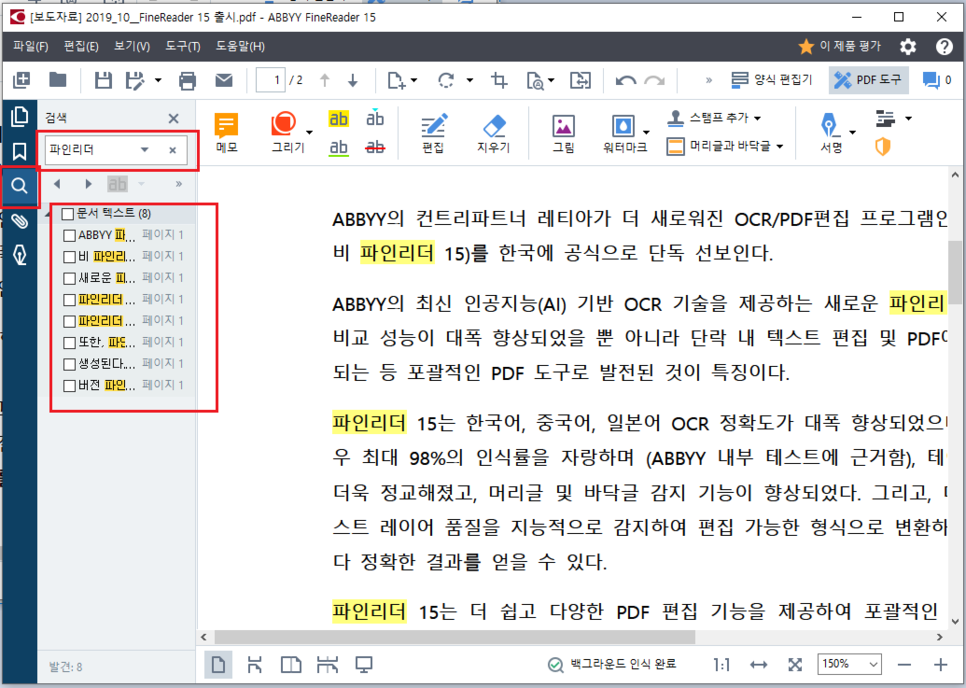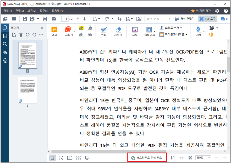 3. PDF파일을 열면 자동으로 OCR처리가 됩니다. 하단의 "백그라운드 인식 완료"를 확인해주세요~