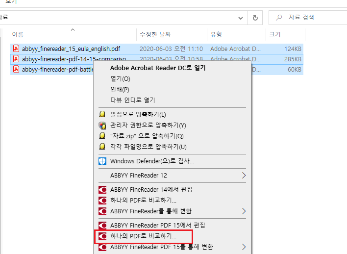 3. 합치려는 PDF파일을 드래그 하여 모두 선택 후 마우스 오른쪽 클릭 > 하나의 PDF로 비교하기 를 선택 해주세요.