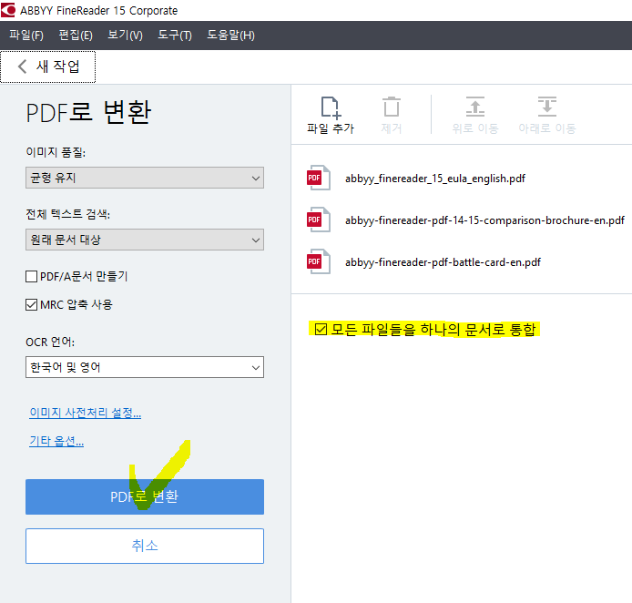 4. "모든 파일들을 하나의 문서로 통합"에 체크 되어 있는 것을 확인 후 "PDF로 변환"을 눌러줍니다.