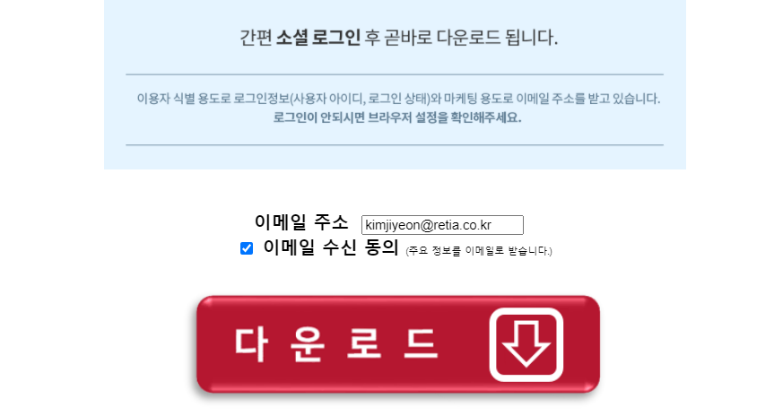 2. 시험판 다운로드 화면이 나오면 이메일 주소로 간편 로그인 후 다운로드 버튼을 클릭합니다.