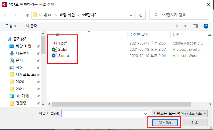합치려는 파일을 모두 선택한 후 열기를 눌러줍니다.