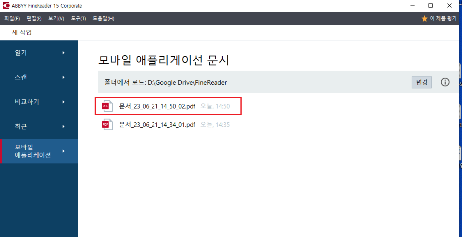 이제 모바일 앱에서 생성한 모든 파일이 FineReader PDF 애플리케이션 화면에 표시 됩니다.