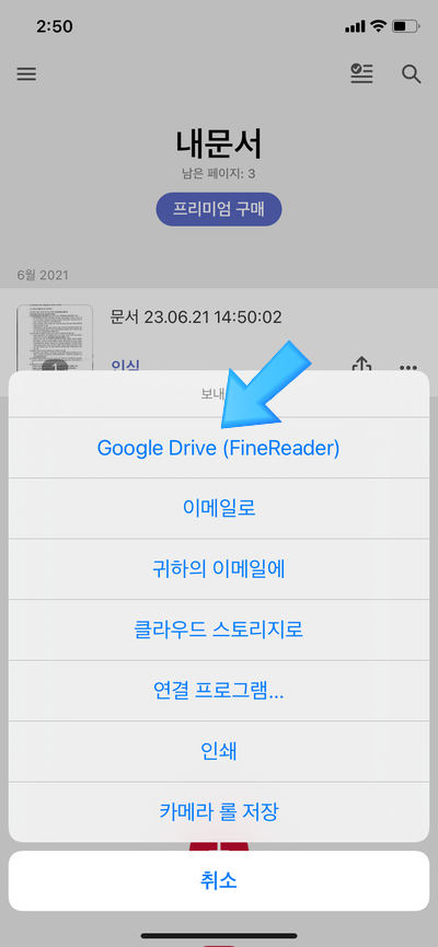 2. Google Drive(FineReader) 내보내기 기능을 사용하여 문서를 PC로 보냅니다.