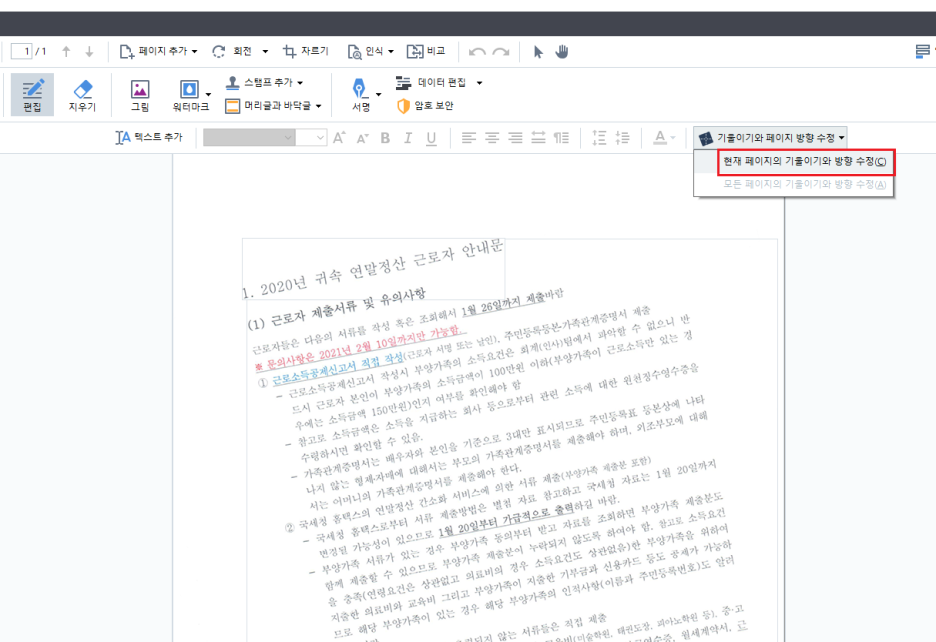 [현재 페이지의 기울이기와 방향 수정] 클릭!