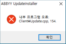 A: 해당 오류 메세지는 FineReader가 업데이트를 위해 사용하는 임시폴더의 경로에 한글이 들어가 있어서 발생한 오류 입니다. Windows에서 기본적으로 사용하는 Temp 경로가 %사용자명% 하위의 폴더로 정해져 있어서 사용자명에 한글이 들어가 있을 경우 이런 오류가 발생 할 수 있습니다.