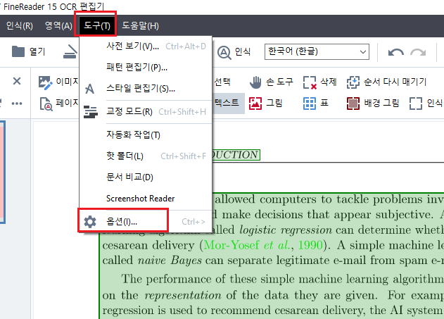 [도구] - [옵션] 으로 들어가 [언어] 에서 OCR 언어 수동 지정을 해 주세요.