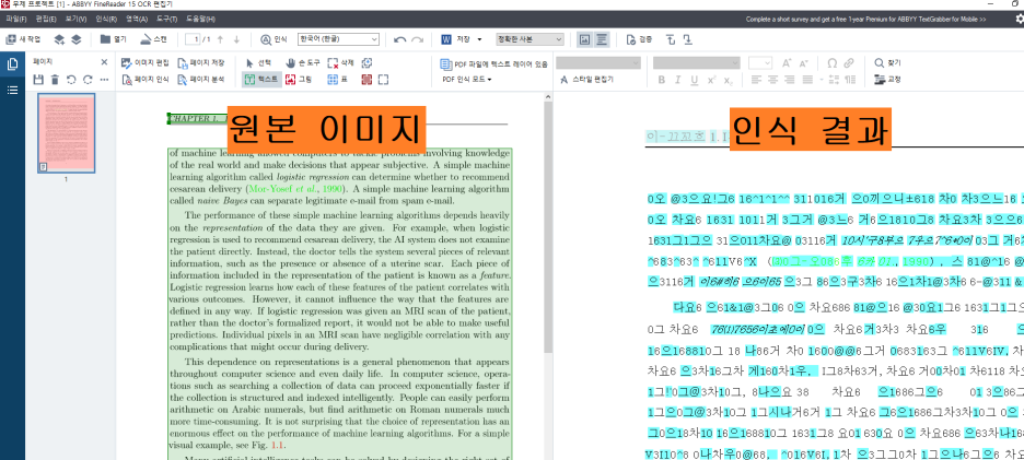 아래 이미지는 원본 이미지의 언어가 영어 인데 인식 언어를 한국어(한글)로 잘못 설정하여