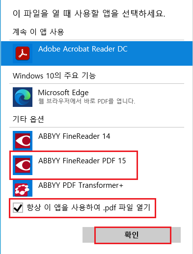 기타 옵션에서 "ABBYY FineReader PDF 15"를 클릭 후 "항상 이 앱을 사용하여 .PDF 파일 열기"에 체크 해 주시고 확인을 눌러주세요~