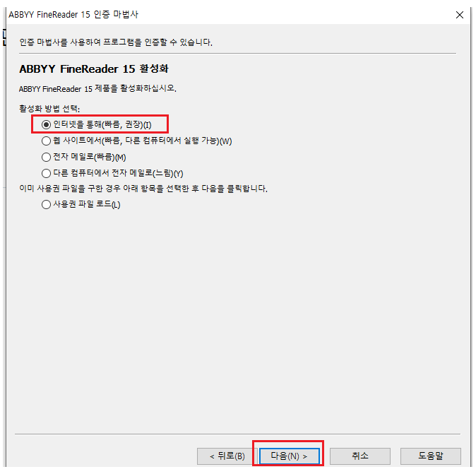 인터넷을 통해(빠름, 권장)을 선택 후 다음을 눌러 주세요.