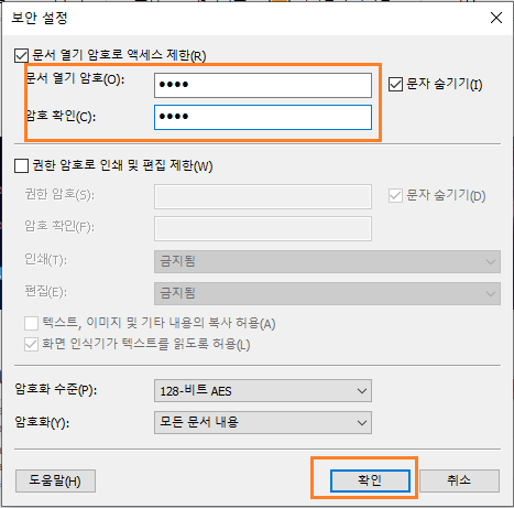 문서 열기 암호로 엑세스 제한에 체크 표시를 하고 암호를 설정해 줍니다.