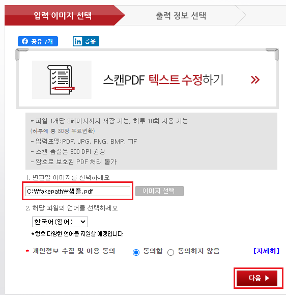 2. 이미지 선택 버튼을 눌러 변환할 이미지를 선택 하고, 언어도 선택해 주세요. 개인정보 수집 및 이용 동의에 체크 후 다음을 눌러 줍니다.