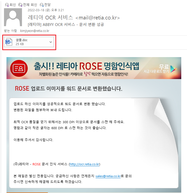 스캔한 문서파일, 이미지, PDF파일을 온라인 상에서 워드 파일로 변환 하는 방법을 알려드릴게요. 별도로 변환프로그램을 설치하지 않아도 되어 매우 편리 합니다. 레티아에서 제공하는 OCR엔진을 사용한 무료 서비스로 업로드한 이미지를 워드 또는 엑셀파일로 변환할 수 있는데요. 변환 결과는 메일로 자동 발송 됩니다.