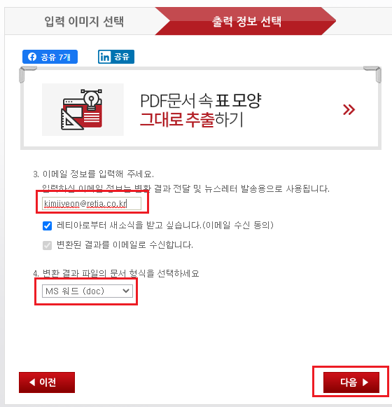 3. 변환 결과를 받을 이메일 주소를 정확하게 입력해 주세요. 변환 결과를 워드로 할건지 엑셀로 할건지도 선택해 주시고요.