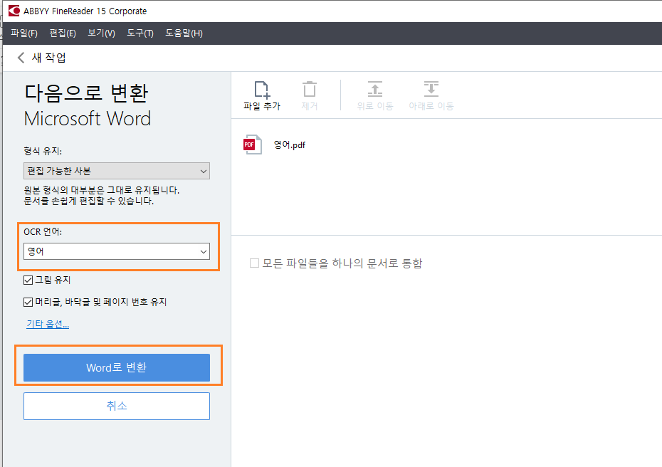 스캔한 문서나 이미지 또는 전자 PDF를 Word로 정확하게 변환할 수 있습니다. ABBYY의 OCR기술로 종이문서의 디지털라이징 작업을 빠르고 쉽게 처리할 수 있는 것 인데요. 다시 타이핑을 할 필요 없이 스캔한 종이 문서, 이미지 파일, PDF파일을 편집 가능한 Word로 즉시 변환 할 수 있습니다. 한번에 모든 문서를 일괄 처리 할 수 있어 문서처리를 보다 더 효율적으로 할 수 있습니다.