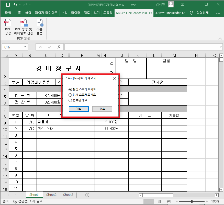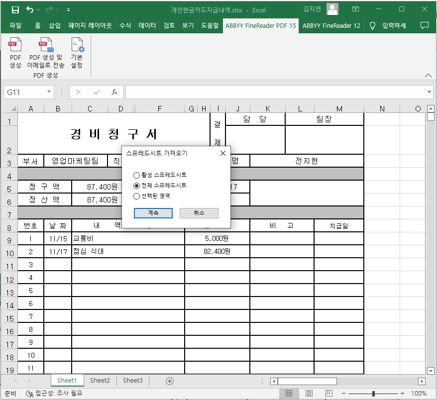 2. 전체 스프레드시트는 Sheet1, Sheet2, Sheet3 전체를 PDF로 생성해 줍니다.