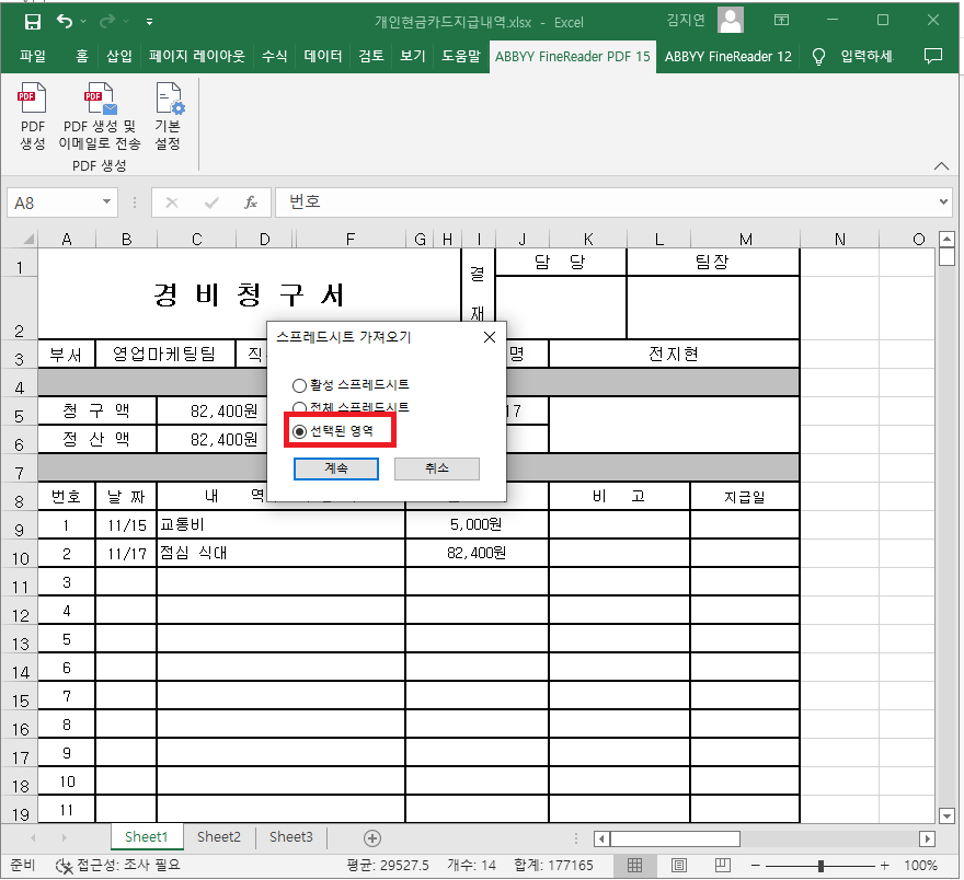 1. 활성 스프레드시트는 현재 보고 있는 엑셀 화면을 PDF로 생성해 줍니다.