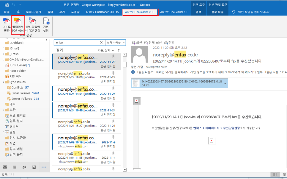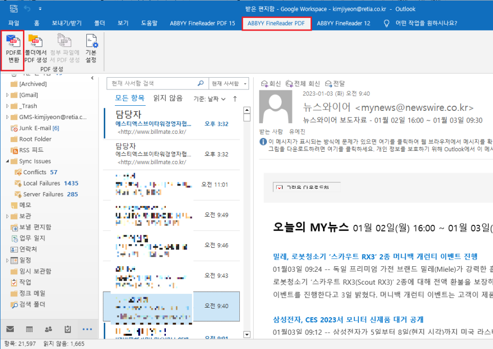 아웃룩 상단의 ABBYY FineReader PDF > PDF로 변환을 클릭 합니다.
