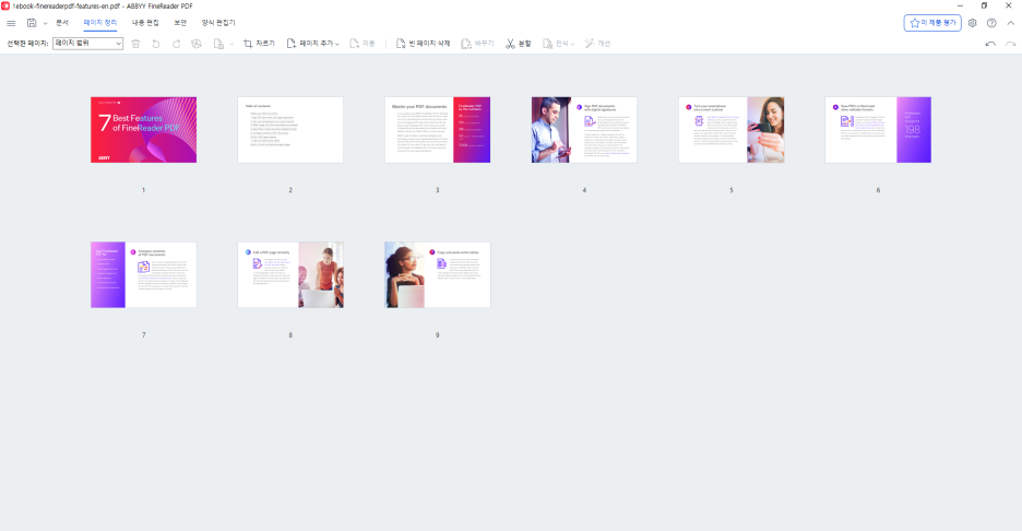 빈 페이지 감지 및 삭제 기능을 통해 불필요한 페이지를 손쉽게 제거할 수 있습니다. PDF문서에서 모든 빈페이지를 찾아 한 번의 클릭으로 삭제 할 수 있고, 삭제하기 전에는 발견된 빈 페이지의 미리보기를 표시하며, 삭제할 페이지와 유지할 페이지를 선택할 수 있습니다.
