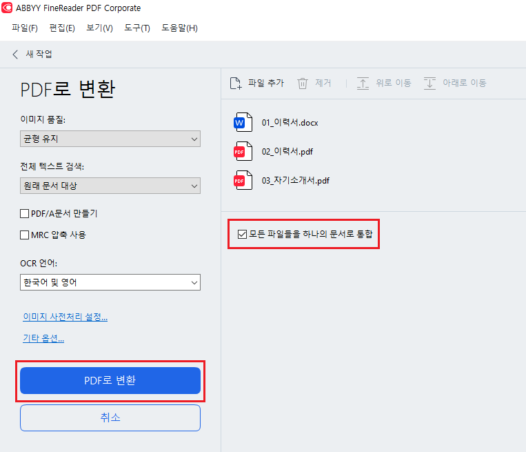 모든 파일들을 하나의 문서로 통합 에 체크 된 것을 확인 후 PDF로 변환을 눌러 줍니다.