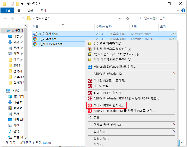 설치가 완료 되면, 이력서와 자기소개서를 선택 하고 마우스 오른쪽 클릭 후 하나의 PDF 로 합치기를 클릭 합니다. 파인리더는 다른 포맷의 파일도 합칠 수 있습니다.
