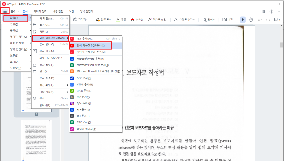 이제 OCR을 입혀 볼게요. 파일 > 다른 이름으로 저장 > 검색 가능한 PDF 문서의 순서로 클릭해 주세요.