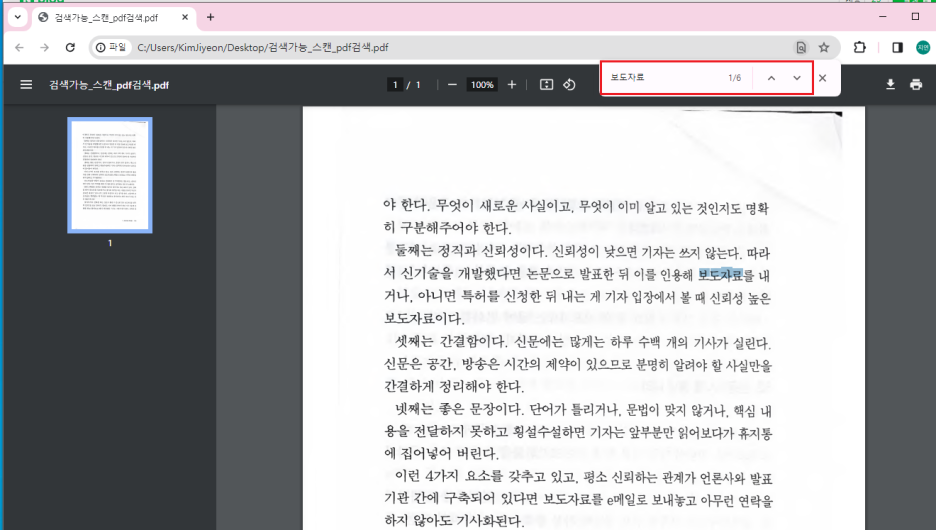 위 PDF파일에서 "보도자료"라는 단어를 검색하고 싶은데, 검색이 되지 않네요. 검색가능한 PDF로 만들기 위해 파인리더PDF를 설치해 볼게요.