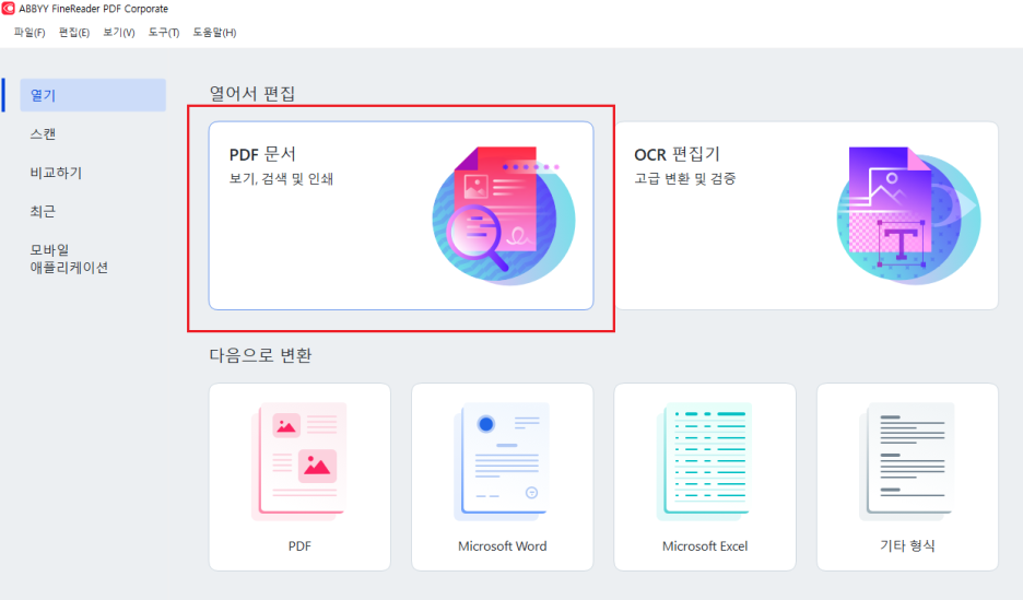 파인리더 PDF에서 "PDF문서" 를 클릭하여 파일을 열어주세요.