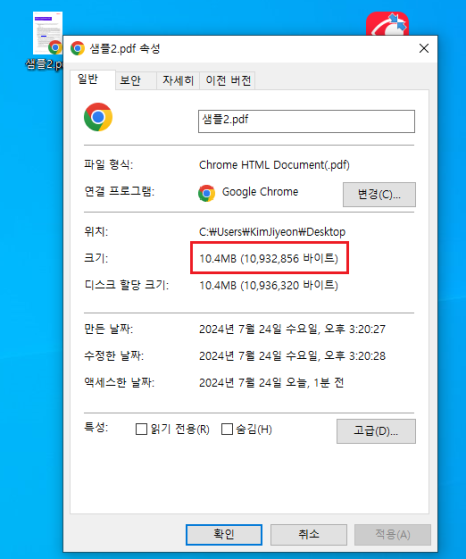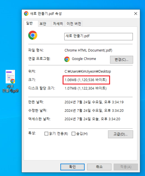 파일크기가 압축 전 10.4MB에서 1.06MB로 대폭 줄어든 것을 확인해 보세요!