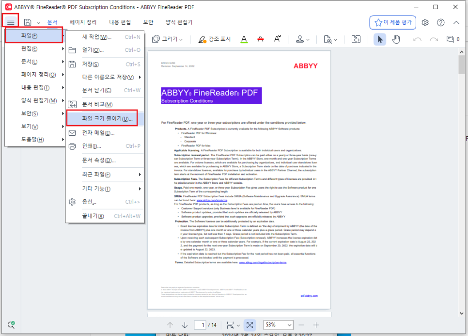 상단 메뉴바에서 [파일]을 클릭하고, [파일 크기 줄이기]를 선택합니다. 이 옵션을 선택하면 PDF파일의 용량을 줄일 수 있는 다양한 설정이 나타납니다.