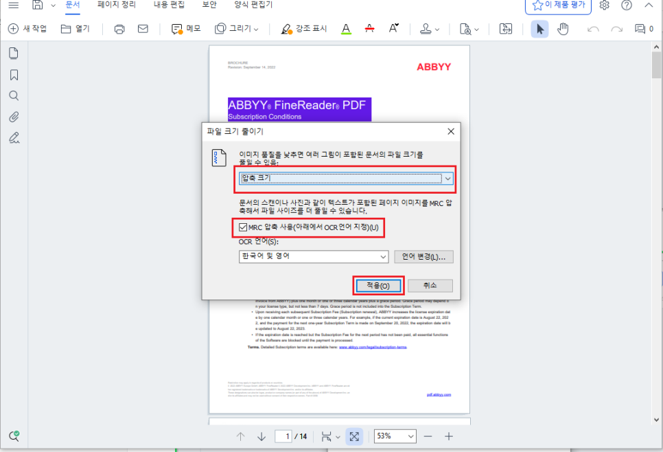 압축 옵션 창에서 MRC 압축 사용을 체크하면 페이지 이미지의 시각적 품질을 유지하면서 파일 크기를 크게 줄일 수 있습니다. 필요한 옵션을 선택한 후 [적용] 버튼을 클릭합니다.