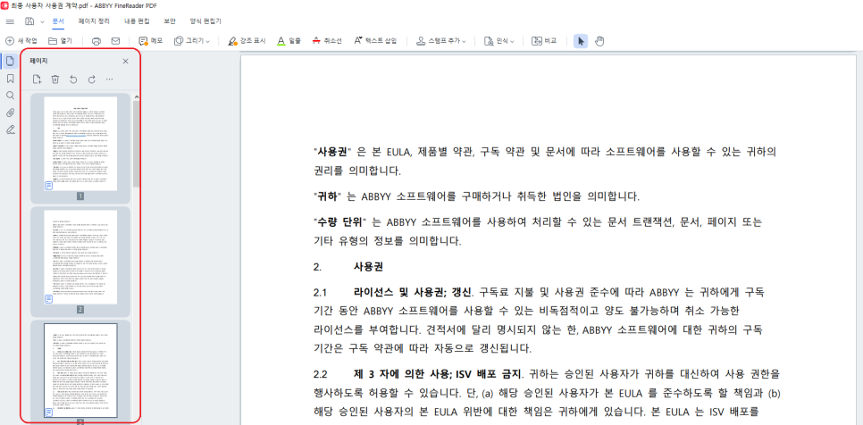 변환할 PDF파일을 열면, PDF파일의 페이지가 화면에 표시됩니다.
