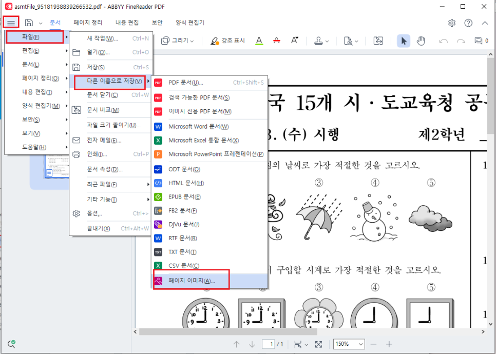 파일 > 다른 이름으로 저장 > 페이지 이미지 의 순서로 클릭 합니다.