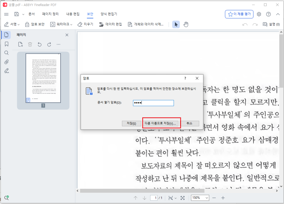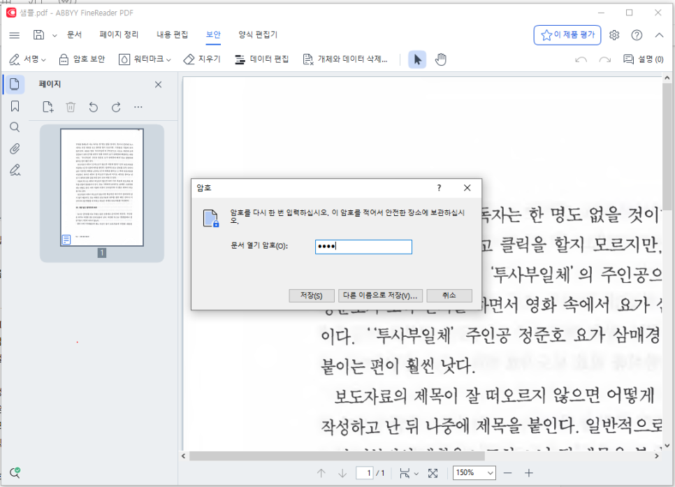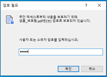 [저장]을 누르고 암호를 입력하면 PDF가 열립니다. 이렇게 PDF에 암호를 설정 할 수 있습니다