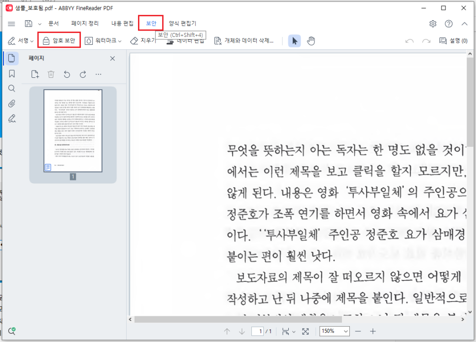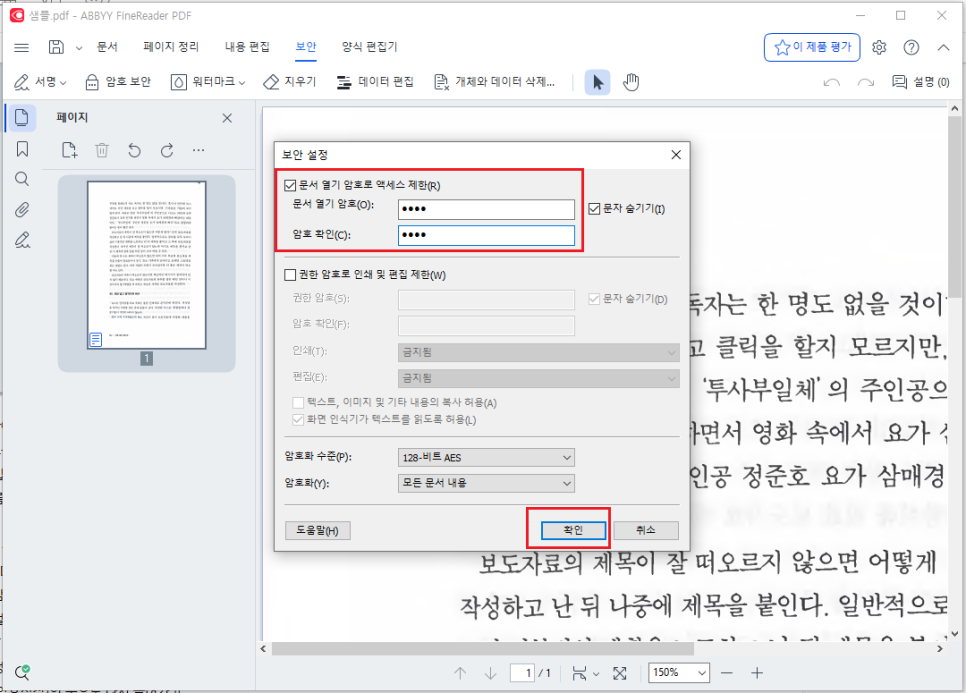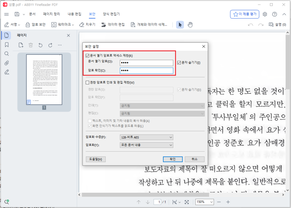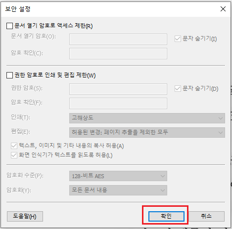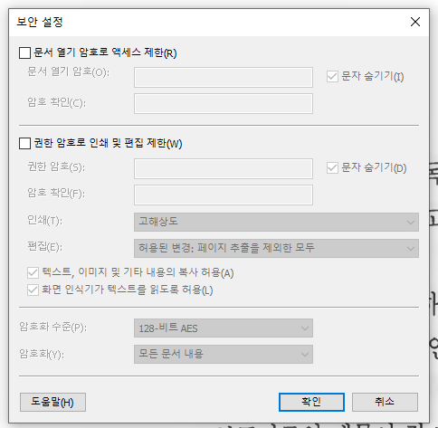 첫번째칸에 암호를 설정하여, PDF를 열때 암호를 입력하게 만들 수 있어요