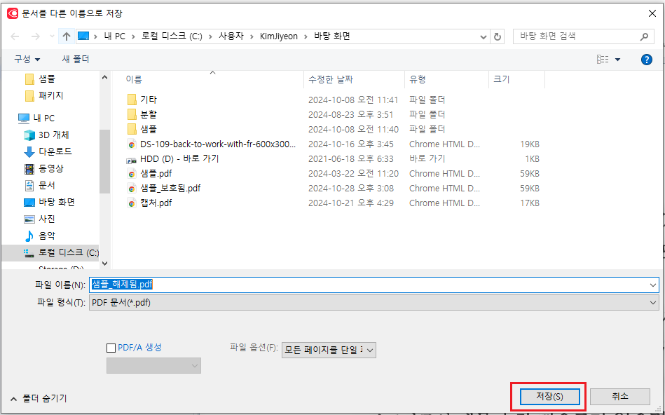 파일명에 "해제됨" 이라고 추가해서 저장해 볼게요. 이제 암호가 해제되어 암호 없이 자유롭게 pdf를 열 수 있습니다.