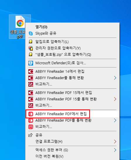 암호가 설정된 pdf에 마우스 오르쪽 클릭을 하고, [ABBYY FineReader PDF]에서 편집 클릭!