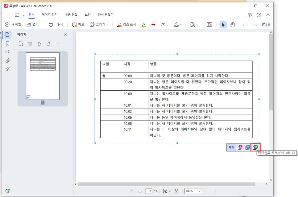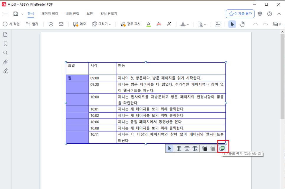 복사할 표를 드래그하여 선택 합니다. "테이블로 복사"버튼을 클릭해 주세요.