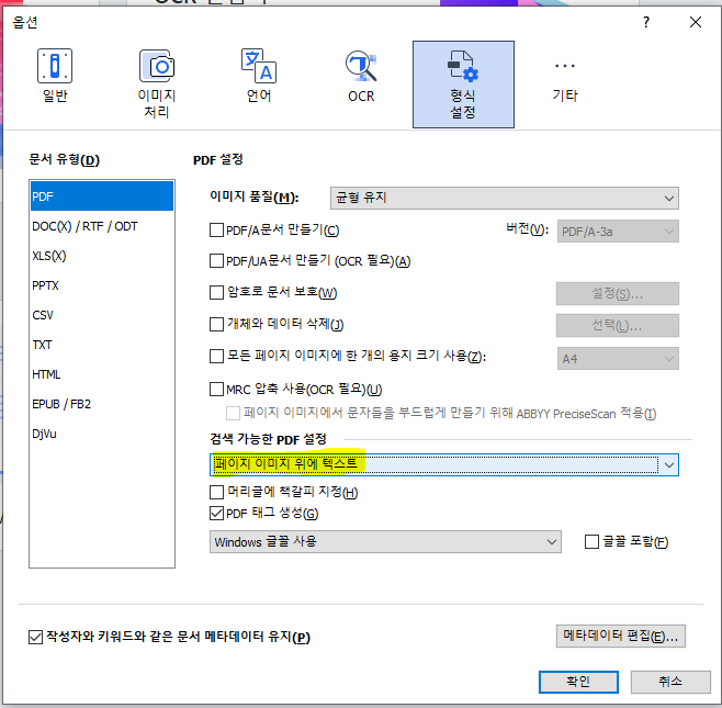 - ‘검색 가능한 PDF’ 설정을 **‘페이지 이미지 위에 텍스트’**로 변경 후 저장