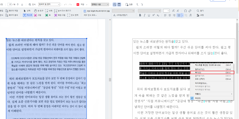 - 복사 가능 PDF : 마우스로 드래그하면 글자 단위로 선택됨