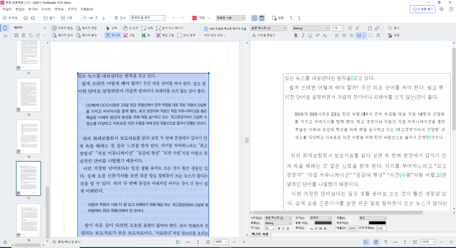 2. 문서가 열리면서 파인리더가 자동으로 텍스트를 인식 (OCR)합니다.