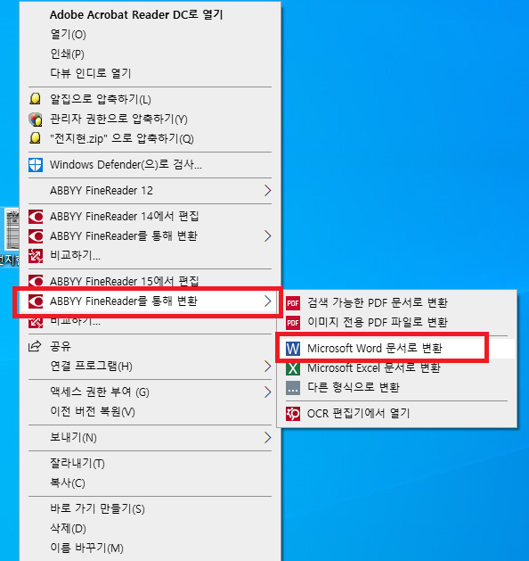 마우스 오른쪽 버튼을 누르면 위 그림과 같이 <ABBYY FineReader 를 통해 변환> 이라는 메뉴가 있습니다.