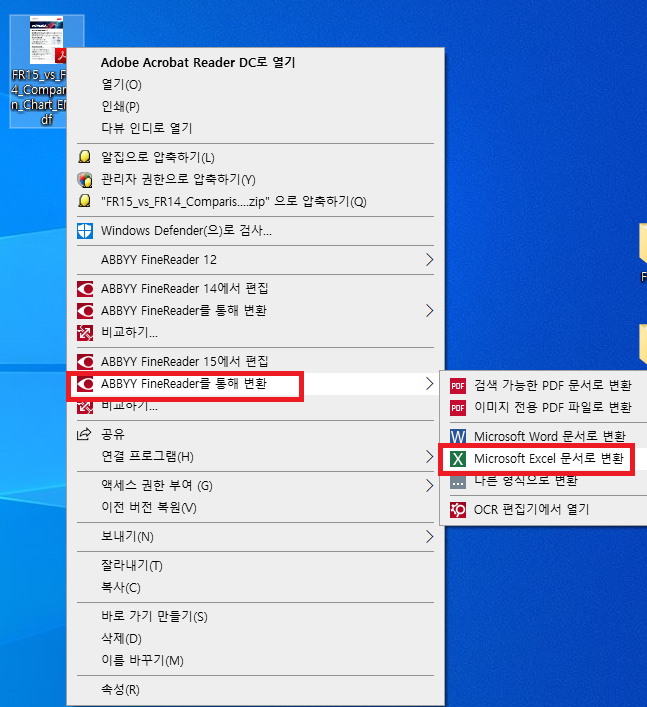 2. PDF 파일에서 오른쪽 마우스 클릭 후 엑셀 문서로 변환을 선택 해주세요.