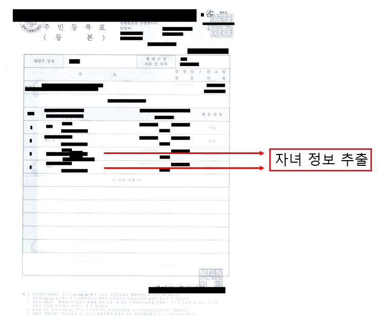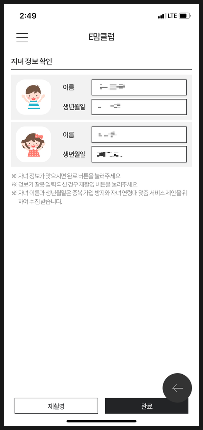 자녀확인 증빙서류(주민등록등본)을 촬영 하면 아이들 이름과 생년월일을 바로 보여줍니다. 맞게 인식이 되었는지 확인하고 완료 버튼을 눌러주면 가입 완료 입니다.