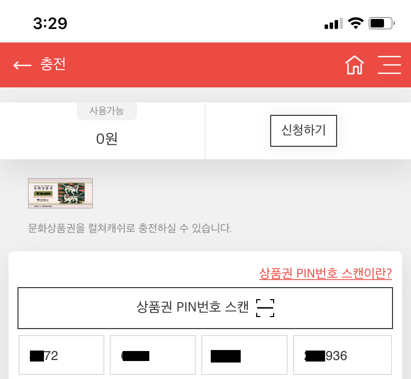 컬쳐랜드 앱 설 치 후 로그인 > 상품권 바코드 숫자(16자리) 스캔 > 충전완료